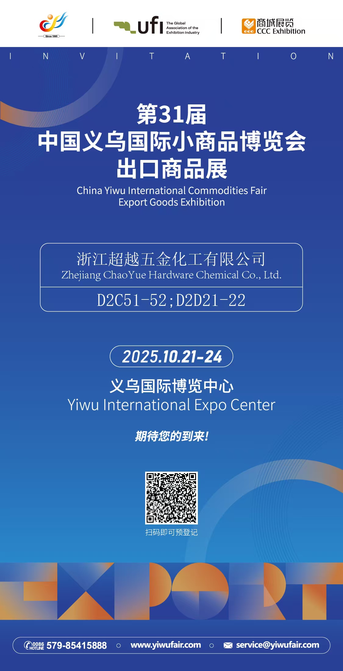 Zhejiang Chaoyue Hardware & Chemical Co., Ltd. is currently participating in the 31st China Yiwu International Commodities Fair – Export Goods Exhibition, held from October 21 to 24, 2025, at the Yiwu International Expo Center in Zhejiang Province, China. Chaoyue is exhibiting at Booth D2C51-52 and D2D21-22.This premier event serves as a vital platform for global trade, attracting thousands of exhibitors and buyers from various industries.